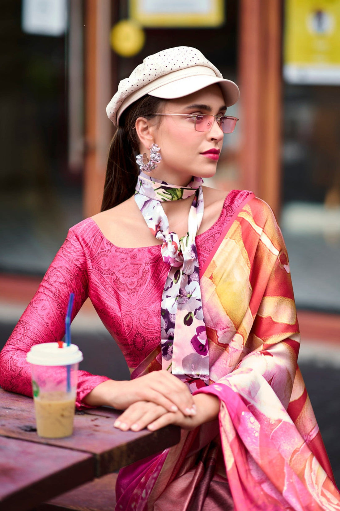Rusty Red and Pink Printed Satin Crepe Silk Saree Online